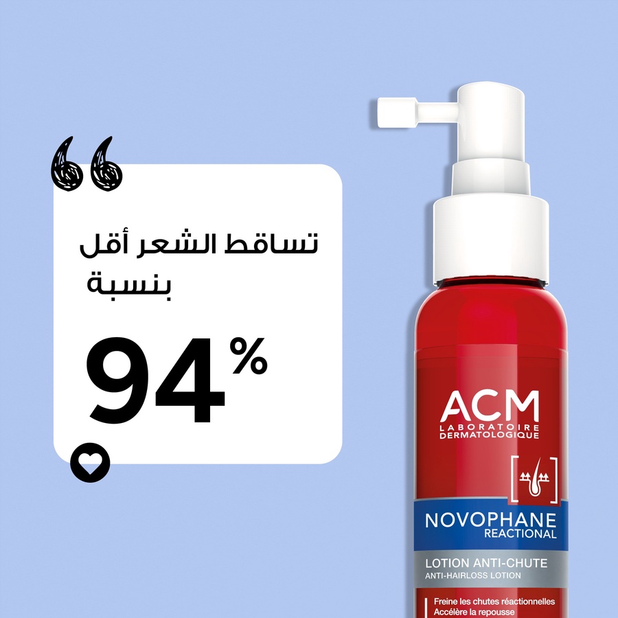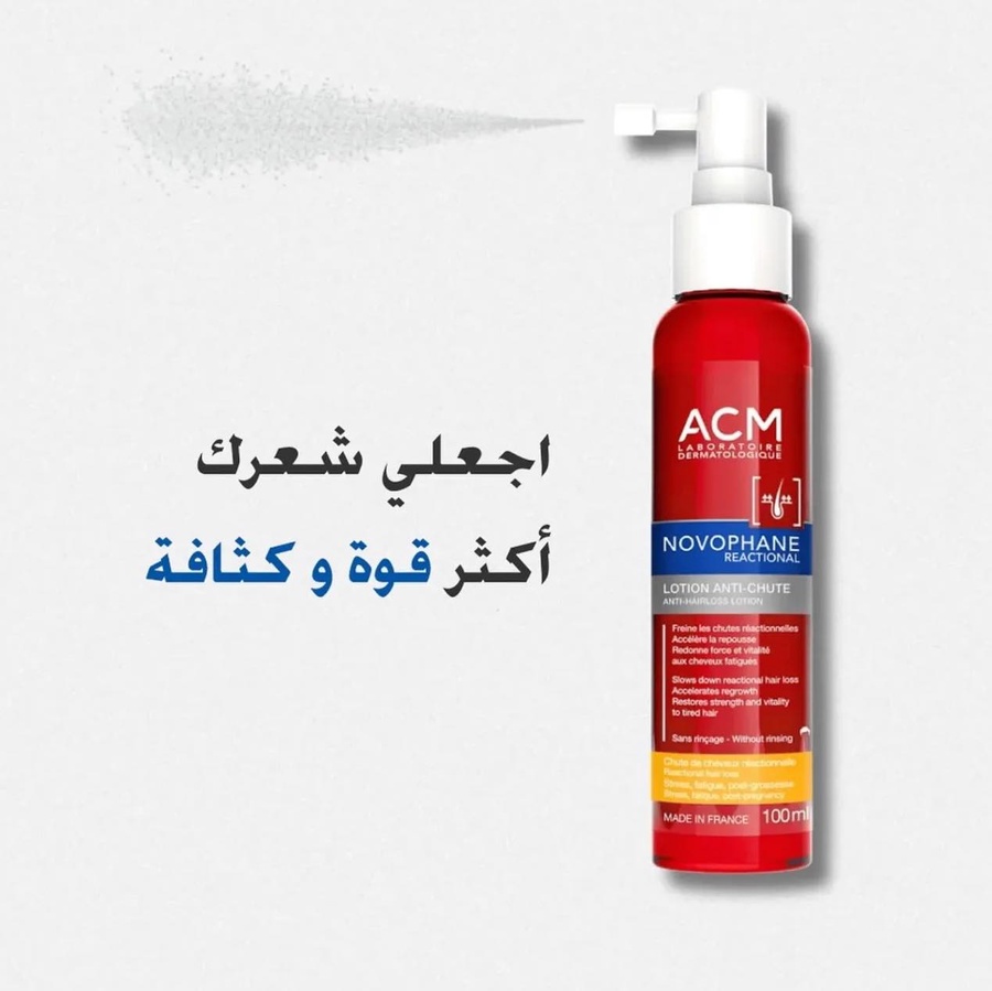 ودعي تساقط الشعر مع لوشن ACM نوفوفان الفرنسي. تركيبة طبية فعالة لتقوية البصيلات وتحفيز النمو، مثالية لحالات التساقط الناتج عن التوتر أو بعد الولادة.