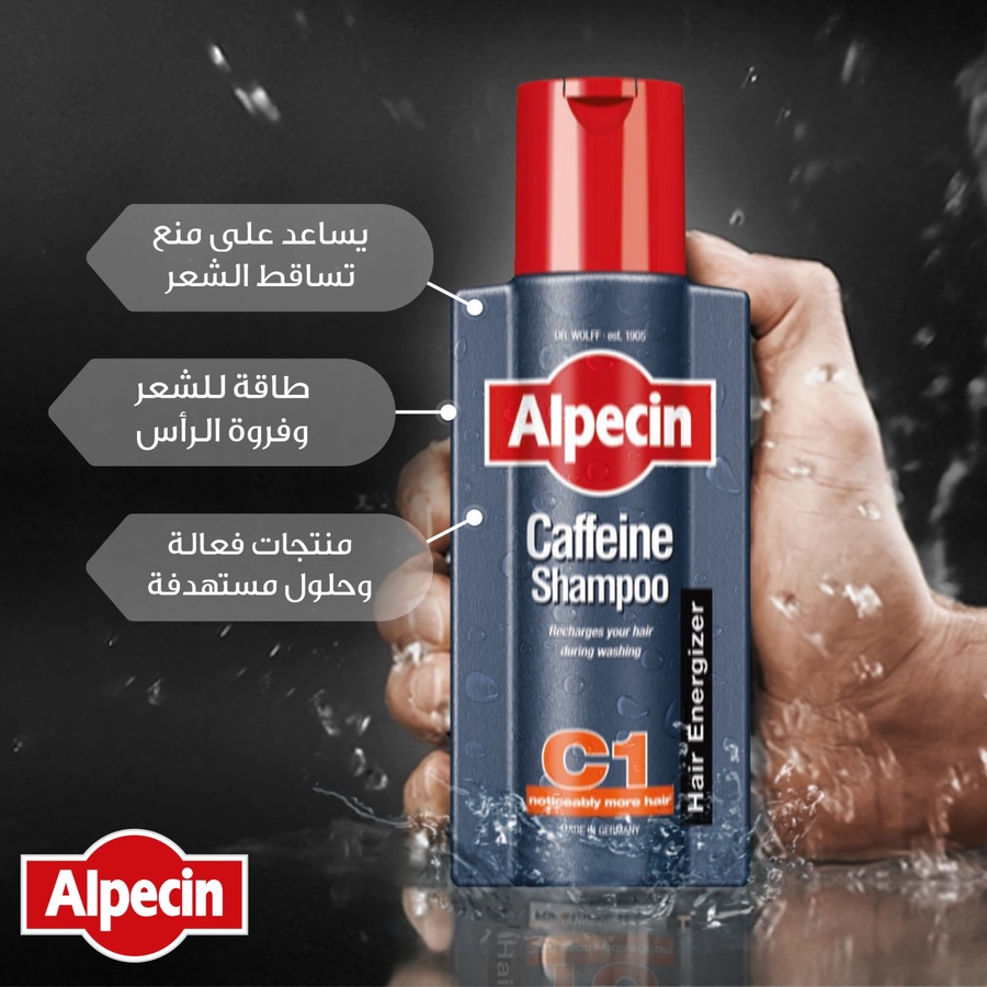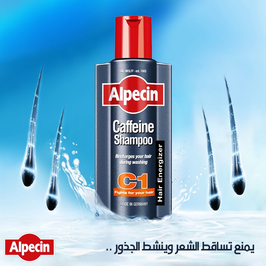 Alpecin C1 شامبو بالكافيين ينشّط جذور الشعر ويقلّل التساقط، يعطي إحساس انتعاش ويقوّي الخصل من الجذور بدون ما يثقل الشعر. Ideal للروتين اليومي.