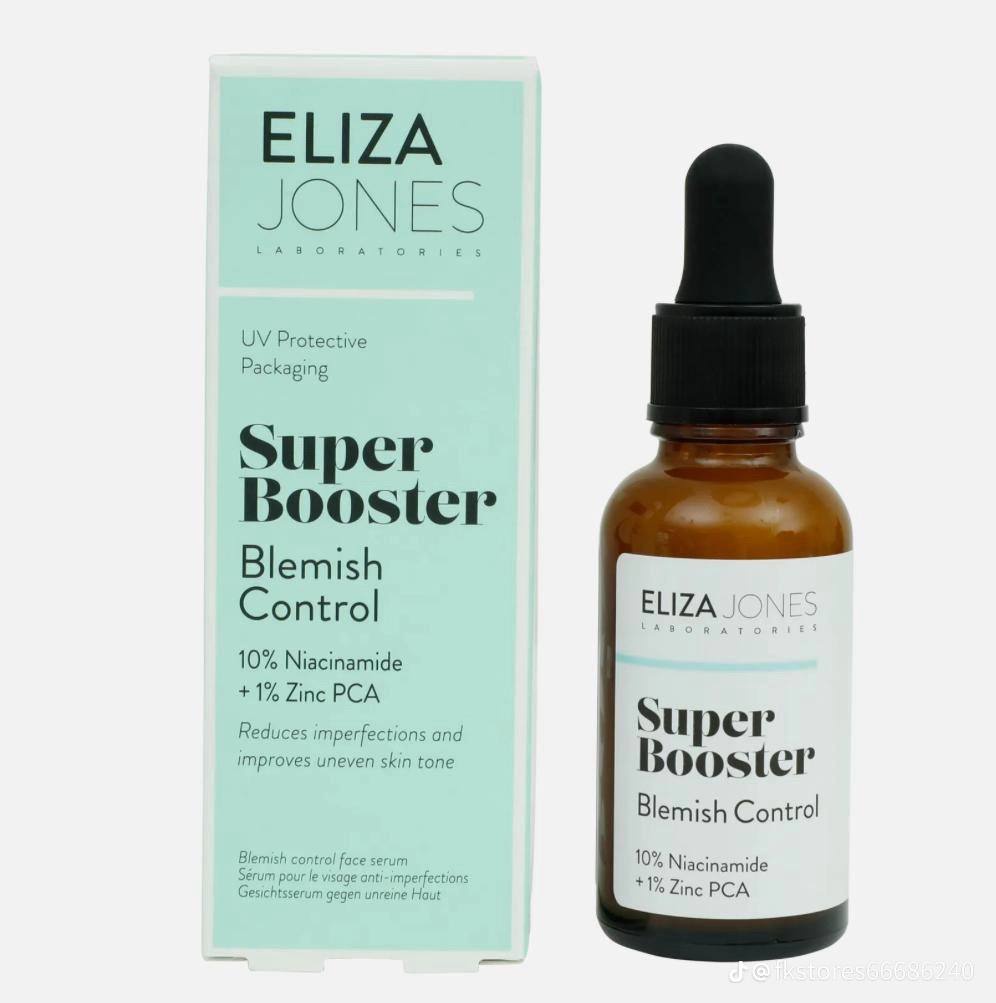 سيروم Eliza Jones Super Booster Blemish Control هو الحل المثالي للبشرة المعرضة للشوائب والمسام الواسعة. بتركيبة فعّالة تحتوي على 10% نياسيناميد + 1% زنك PCA، يمنحك عناية متكاملة تساعد على: