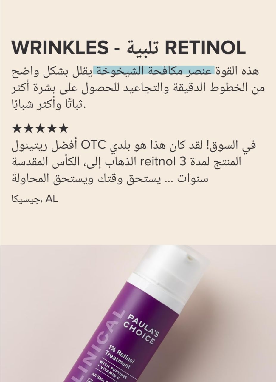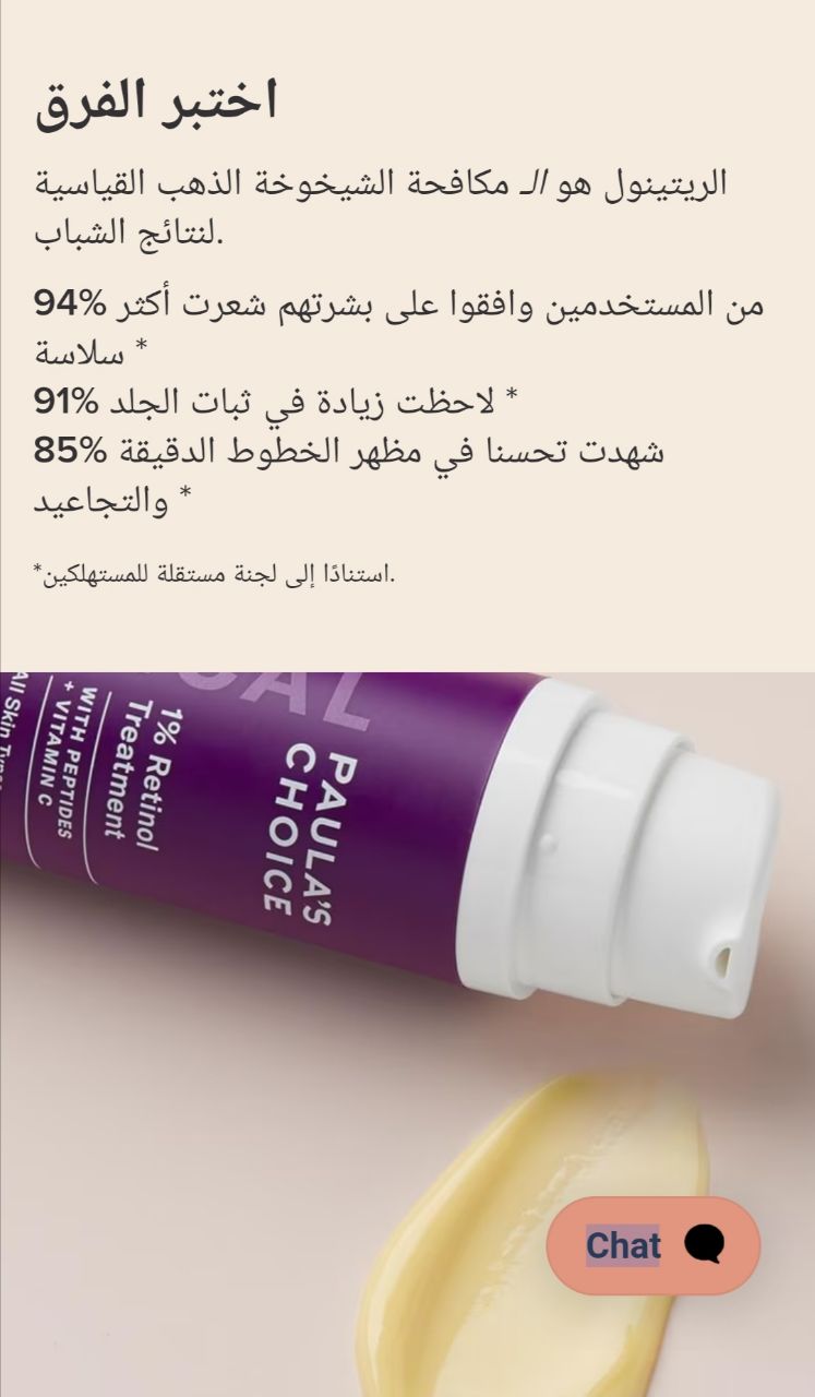 - الريتينول (فيتامين أ) 1%: تركيز قوي وبطيء الإطلاق يحسن علامات الشيخوخة بشكل واضح.
