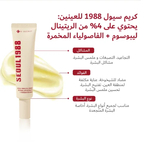 ودّع الهالات والخطوط الدقيقة مع كريم العيون سيؤول 1988، بتقنية الريتينال ليبوسوم 4% الممزوج بمستخلصات طبيعية مخمّرة تمنح بشرتك إشراقة وشباب متجدد.